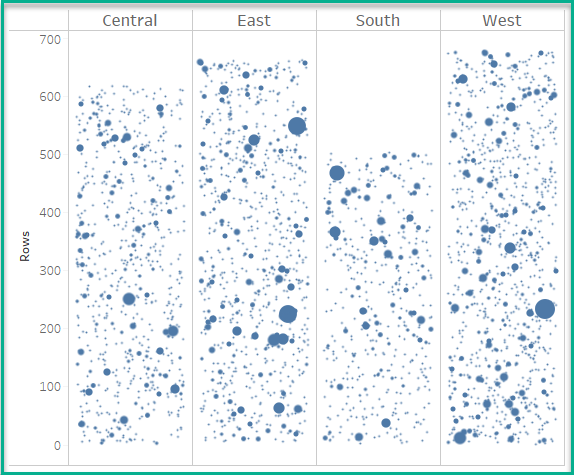 We are looking at the total customers for each Region in the Rows. The totals for each region are the same as displayed in the first bar chart of this article. (618 for Central etc.) The difference is that every dot in this chart is a distinct Customer Name.